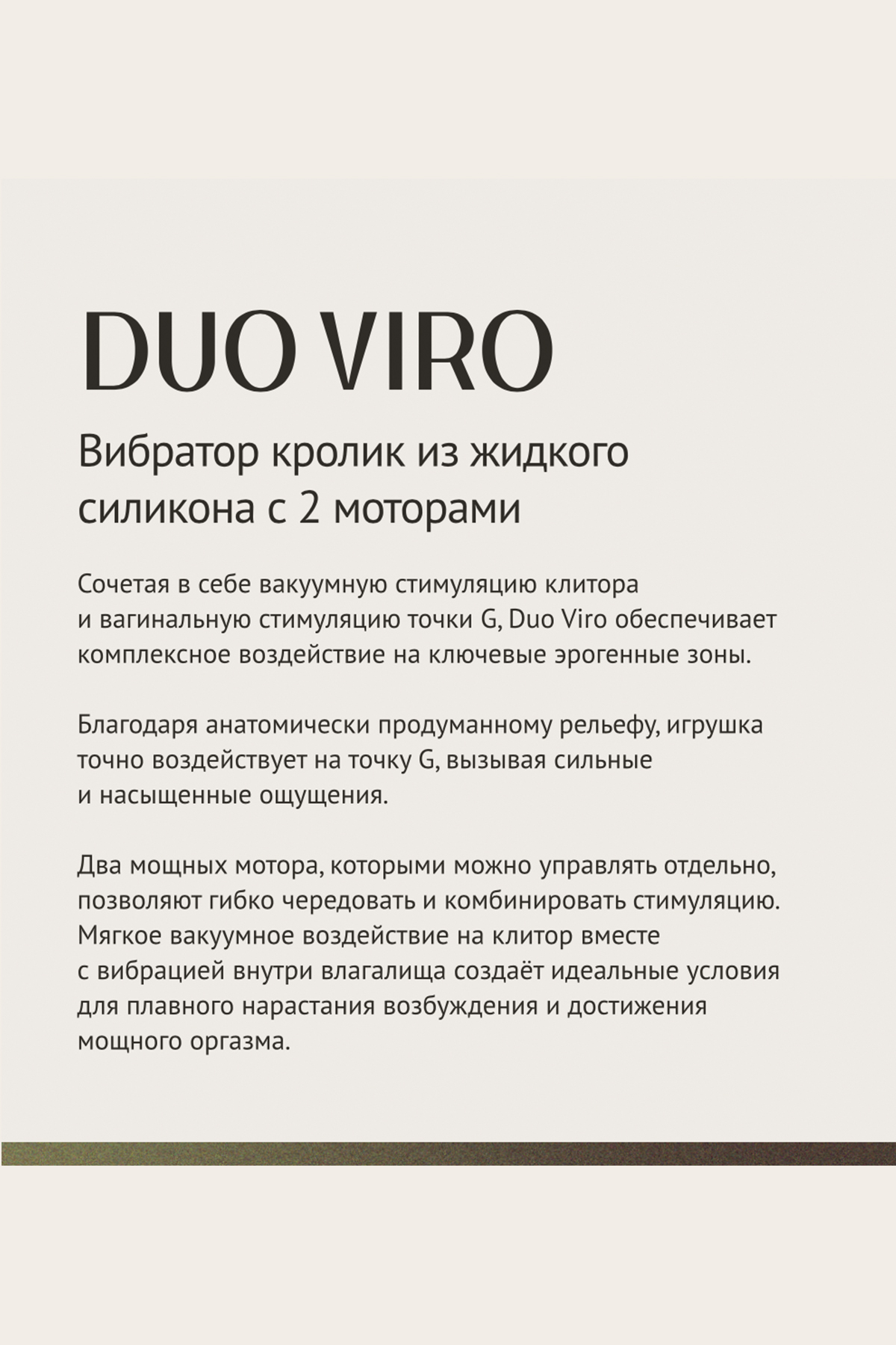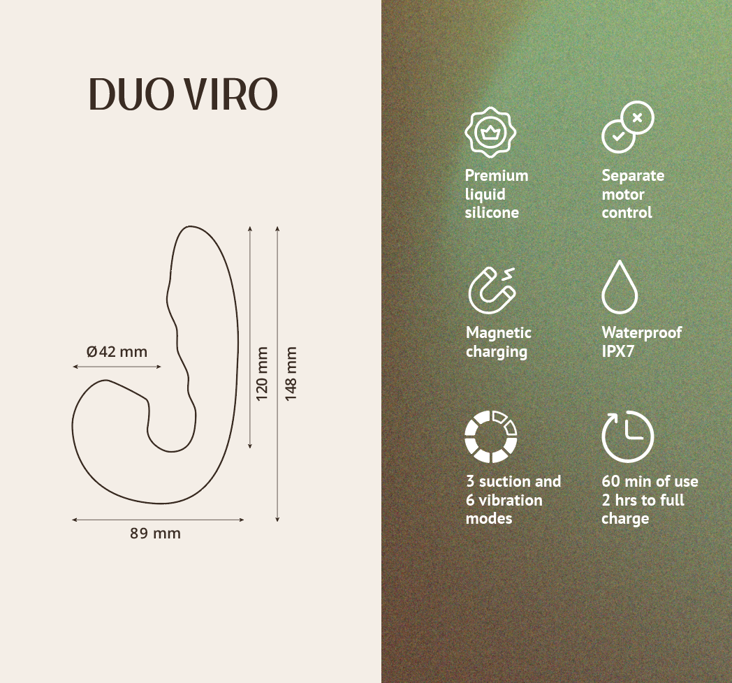 Сочетая в себе вакуумную стимуляцию клитора и вагинальную стимуляцию точки G, Duo Viro обеспечивает комплексное воздействие на ключевые эрогенные зоны. Благодаря анатомически продуманному рельефу, игрушка точно воздействует на точку G, вызывая сильные и насыщенные ощущения. Два мощных мотора, которые можно управлять отдельно, позволяют гибко чередовать и комбинировать стимуляцию. Вы можете использовать вакуумную стимуляцию и вагинальную вибрацию как одновременно, так и по отдельности, что даёт полную свободу для экспериментов с ощущениями.